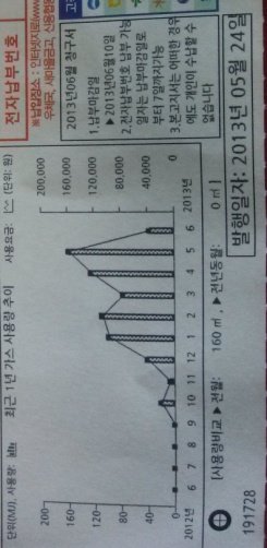 지로통지서에 찍힌 최근 1년 가스 사용량 추이 그래프를 비교해봐도 알수 있습니다. 2012년 10월 20,930원 11월 7560원 12월 41,310원 2013년 1월 98,370원 2월 107,380원 3월 76,790원 이었고 납부를 하였습니다. 그 이후 4월 125,840원 5월 159,060원 6월 38,910원 이 청구 되었습니다. 보시다시피 가장 추운겨울인 12월, 1월, 2월 3월 까지에 비해 4,5월에 요금이 더 많이 나온다는 건 누가봐도 이해가 안 되지 않습니까???? 4월요금은 2-3월의 사용량. 5월 요금은 3-4월의 사용량에 대해 청구가 되는것인데. 특히 3월 같은경우 해외 교육,워크샵등으로 다른때 보다 집에 있는 시간이 적었던 때입니다. 담당 지역 콜센터를 통해, 검침원 그리고 지역관할 부서의 부장과 통화했지만 해결되지 않았습니다. 제가 사는 빌라에 총 5세대가 살고 있습니다. 얼마전 윗 집의 이웃에게 물어봤더니 애기를 키우고 하루종일 집에서 생활하는 가정주부이지만 한 겨울 하루종일 난방을 틀어도 10만원 남짓한 금액이 나온다고 이해할수 없다고 말했습니다. 지역관할에 문의했으나 해결책이 없다는 답변 뿐입니다.