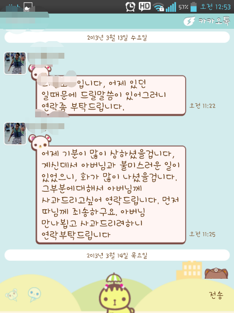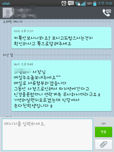 집접찾아뵙고 사과하고 싶다하더니 연락을 무시한다 이런무례한경우가 어디있냐 하며 저희집주소도 갈켜줬죠... 그런데 그런데 이제는 안통하는지 그뒤로 계~~속 연락두절~~~ 화가났지만 전 집요하게 4달동안 틈틈히 문자며 카톡이며 보냈습니다![]()