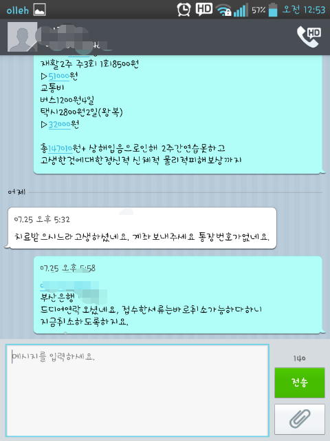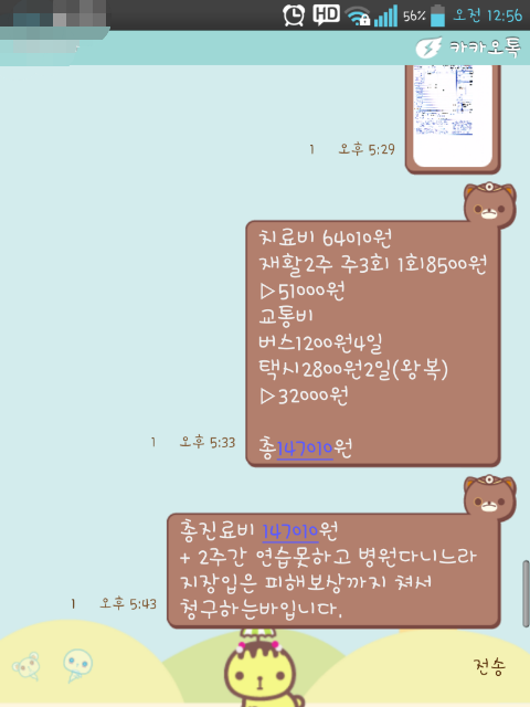 요런 답변을 주시더라구요 결론적으로 저는 그 사장남자에게 치료비를 받을수 있는 궐리가있단소리죠! 그래서 이정보들을 들고 사장님께 마지막경고를 카톡이며 문자며 보냈죠!! 하루가 지나도록 연락이없더니 다음날 연락이왔더라구욧!! 치료받느라 고생하셨겠네요 계좌번호가없네요 주세요 하고요ㅎㅎ... 계속 무시하더니.. 제가 이렇게 유치하게나오니... 드디어 답을... 에휴... 그래도 결국!! 147010원!! 진짜 10원까지ㅋㅋ 임금을하셨더라구욧 이제껏 열받게했던거생각하면 정신적피해보상? 뭐그런거까지해서 받고싶은맘도있었지만 뭐 치료비받아낸걸로도 아주 기쁘답니다!!![]()