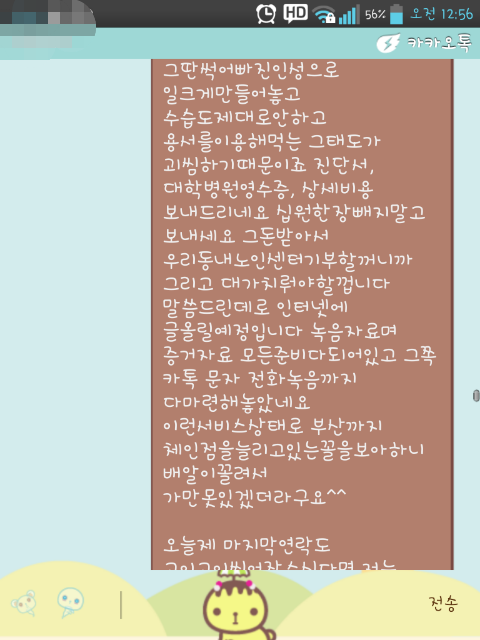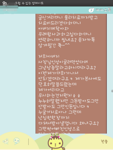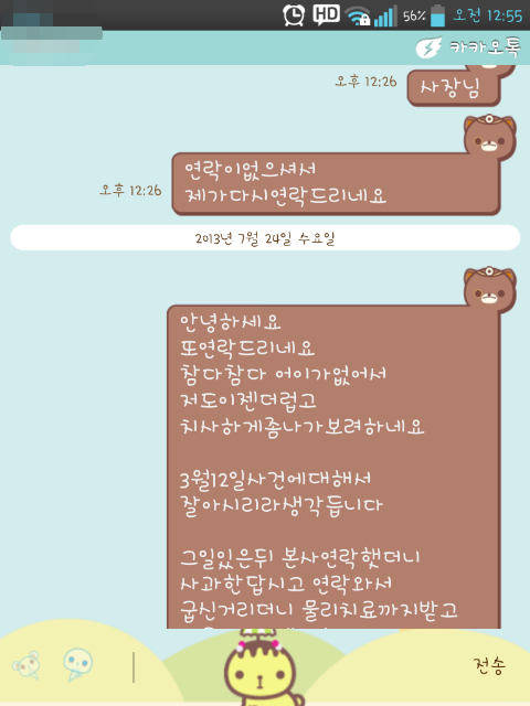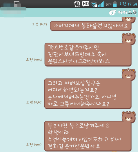그래도 성과라고하면 다음날 바로 카톡이며 전화며~ 그 사장남자에게 연락이오더라구요 180도바껴서 죄송하다며 아버지 찾아뵙고 사과드리고싶다고... 막상 사과받고나니 본사에 일러바친게 미안하기도하면서 됫어 그냥 치료비만받음됬지 뭐 이런생각이였구요 저희아버지는 지금까지도 그 젊은남자한테 들어먹은욕이 화가나시는지 상종하기싫다는 말씀만 반복하시길래 그대로 전하고 치료비청구는 어디로 어떻게 하면 될지 진단서는 어디로 보낼지에대해 물었습니다 그랬더니 그뒤로 잠수~ 계~~속 저를 무시하시더라구요ㅠㅠㅠ 그래서 다시 본사에 글을 보냈지요ㅋ