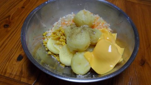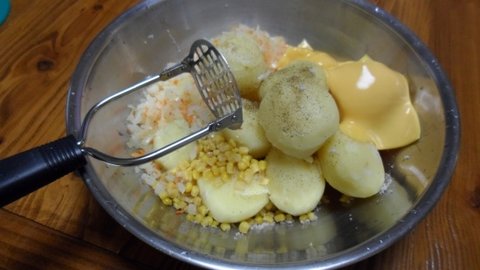 4. 폭 익은 감자와 다진 볶은 야채(양파와 당근), 캔옥수수, 슬라이스 치즈(요건 꼭 넣어야해용)