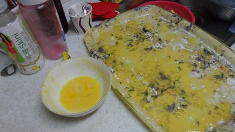 (2) 그 다음 계란물을 묻힙니다. (계란을 풀어준 물입니다. 계란푼계란물!