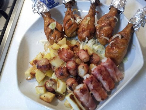 닭다리 조려서 구운..거 (이렇게 자주해먹어요! 조린다음에 구우면 양념은 양념대로잘 스며들고 구워서 겉에 노릇한 식감도 느낄 수 있고요..), 구운 감자+볶은 양파와 버무린 잘게 썰은 베이컨떡말이.. 제목이 길죠..