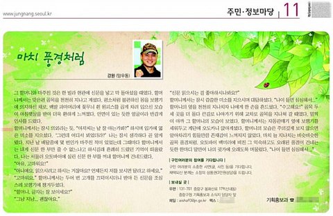 몇 주 전 중랑구에서 매월 발행하는 중랑구 소식지에 나의 글을 투고했다. (이 글은 내 블로그 지난 7월 3일자 배달일지에 올려져 있다.)