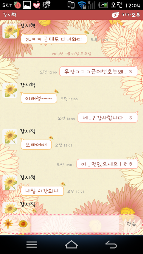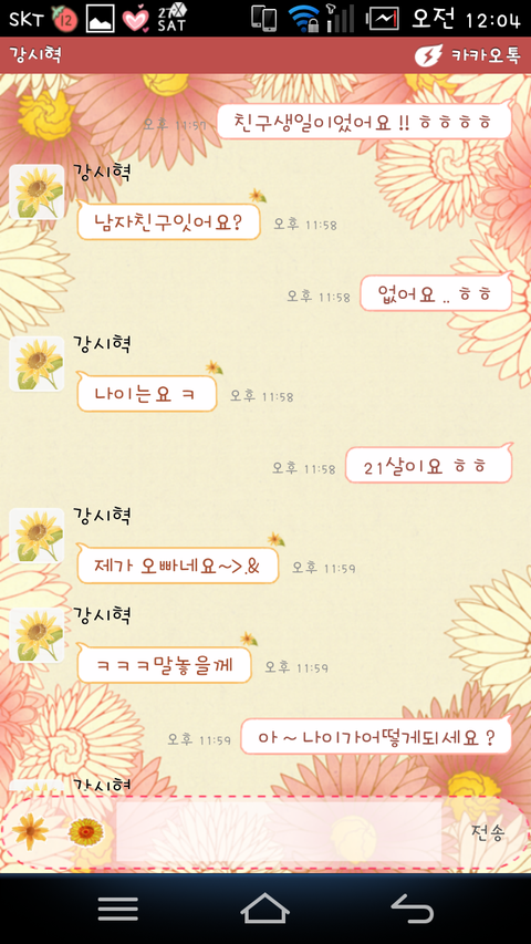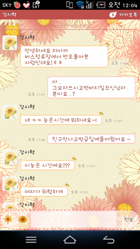 그런데그분이 영화처럼 저에게 번호를 따가신거에요 !! 그후로 친구를 만나서 노는와중에도 그분이 생각나고 톡이 언제올까 생각도되고 그러다 집에 왔는데 톡하나가 와있는거에요. 보니까 그분이더라구요. 이름은 강시혁이고. 나이는 24살이에요.
