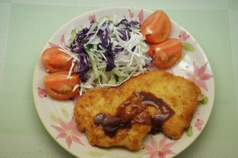 8.야채를 옆에 담고 돈까스를 올려서 주고 소스를 올려 줍니다.