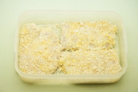 6.빵가루까지 묻힌 돼지고기는 통에 차곡 차곡 올려서 냉동 보관해서 먹고 싶다고 할 때 요리를 해 줍니다.