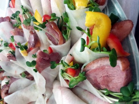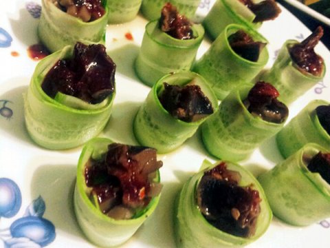 오이롤은 오이를 감자칼?로 썰어서 도토리묵 썰어 넣고 골뱅이 한조각씩 올리고