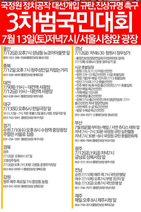 서울에서는 매일 7시 저녁 광화문 동아일보 앞(5번출구)에서 촛불집회가 계속됩니다