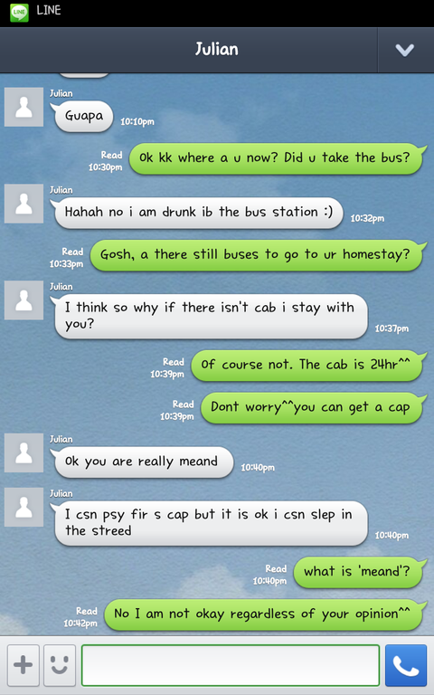 7. 자기 길거리서 자도 되는거냐 뭐라뭐라 하는데 이런걸로 장난길게 치기도 싫고, 영국 놀러올 계획이던 한국남 몇명이 떠보듯 혹은 장난으로 물어본 말에도 남친이 승질났어서 그냥 잘시간이라고 말을 자르려함.
