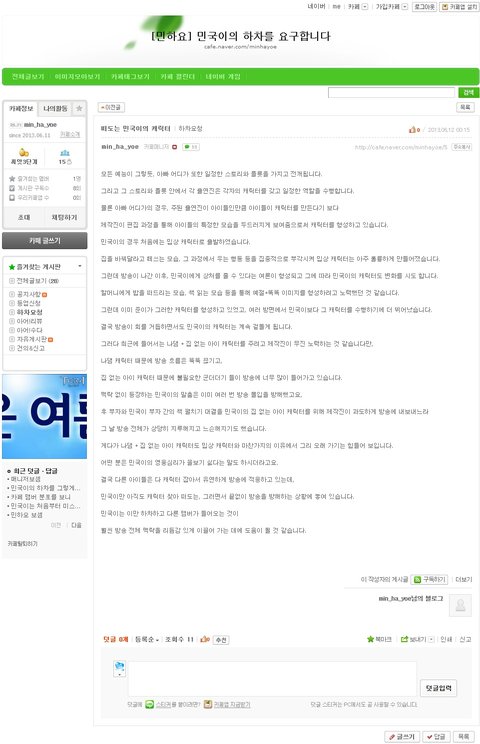 근데 이번엔 네이버에 "[민하요] 민국이의 하차를 요구합니다" 라는 카페가 있습니다