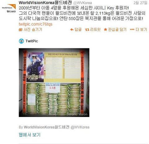 키는 지난 2009 년부터 월드 비전을 통해 우간다, 인도, 에티오피 아, 보스니아 등 총 4 명의 아동을 지원하고있다. 바쁜 일정에서도 지원 아동에 정기적으로 선물이나 편지를 보내 고있는 것으로 나타났다.