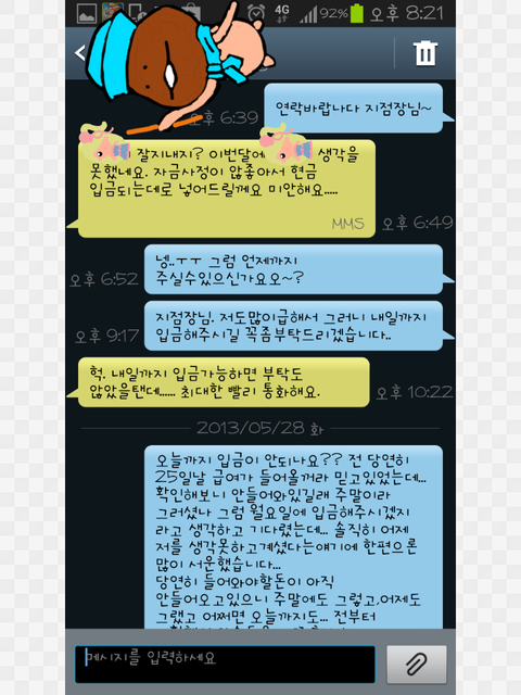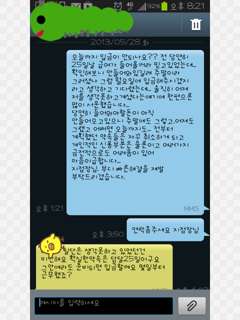저희 아버지께서도 굉장히 화를내셨어요. 일을 그만둔지가 언젠데 이렇게 질질끄냐고 언제까지 그사람 사정을 봐줘야하는거냐고 바로 신고를 하라고 하시지만 솔직히 지점장님이 돈을 안주실분이아니라는걸 믿어서 서로 얼굴 붉혀가면서 싸우고 싶지않아서 최대한 이성적으로 참고 기다리는데 마지막 카톡내용을 보시다시피 자꾸 연락을 피하고있어서 불안하고 화가나고 이젠 저도 한계에 도달한것같아 마냥 기다리고만 있지않을려구요. 그래서 지점장한테 마지막으로 강하게 어필을 하고싶은데 어떤방식으로 접근하는게 좋을까싶어 여러분들에게 도움을 요청하는거에요.