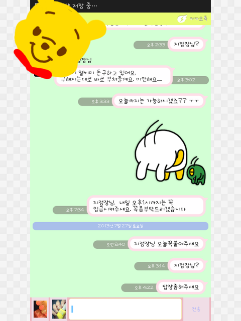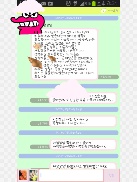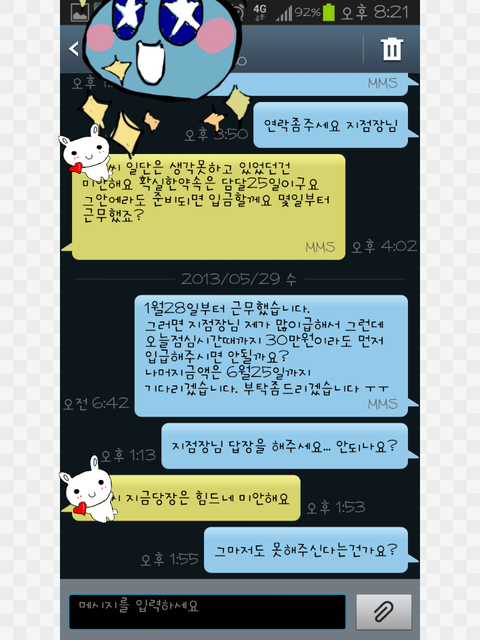 언니 : 아니 지점장님이 그런얘기도 안해주던가요…? 우리월급은 회사에서 주는게 아니라 지점장이 주는데 회사방침이 그렇게 정해져있어서 한달늦게 급여가 나온다네요.. 나도 처음에 이말듣고 때려치우려다가 근무조건이 좋아서 마지못해 하고있잖아… .