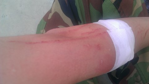 당시 a가 물어서 생긴 팔의 상처를 찍은 사진입니다. 목과 이마등에는 손톱으로 살이 파일 정도의