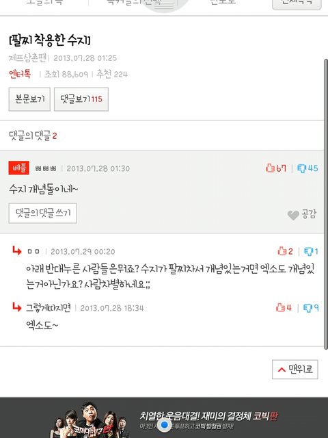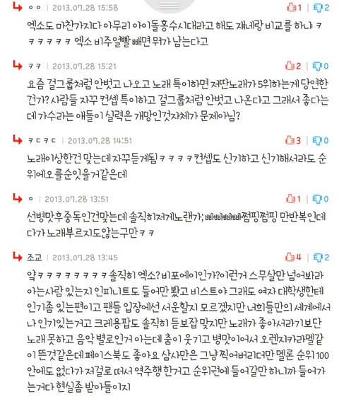 진짜 뭐하자는거야 니네 안티양성하려고 작정한건가?아오 무개념들진짜 작작좀해 도배쫌하지말라고 니들이그러고 설치고있는게 니오빠들 이미지깎아먹는일이야알어? 캡쳐볼래 추천반대수? 보고 뭐 느껴지는거없니 또 말같지도않은 열폭소리할래? 내가얘네한테 무슨열등감을느껴 개소리좀작작하고 ㅋㅋㅋ수지판에 뜬금포엑소는 왜튀어나오고 ㅈㄹ이고 뭐차별지랄같은소리하네 그럼팔찌착용한 공인들이름 다나와야되나 수지판에????ㅋㅋㅋㅋㅋ그리고 왜굳이 엔터톡엑소채널까지 와서 이러냐고하는데 이런빠가년들아 마지막캡쳐보이냐 앞에채널이름따윈 안나온다고 미안해지는짤 저거니네거잖아 뭔지도모르고 아무생각없이 들어갔는데 또 엑소엑소 그놈의엑소 나진짜 아이돌관심도없고 얘네가누군지도몰랐는데 자꾸이딴식으로 개념없이마구잡이로 눈에보이니까 짜증나고 진심으로 너무싫어 제발영원히 들어갔으면좋겠어 걸!레소리나하는 양아치새끼들 뭐좋다고 헉헉대는거야 골빈년들 제발 개념좀지키자 짜증나니까진짜앂ㄹ