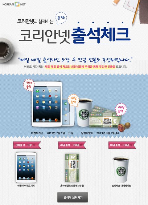 바로 출석체크 이벤트 인데요 ~ 코리안넷에서 진행하는거라네요? ㅎ 출석만 해도 아이패드를 준다니… 저도 해야겠어요 ! ㅋㅋㅋㅋ