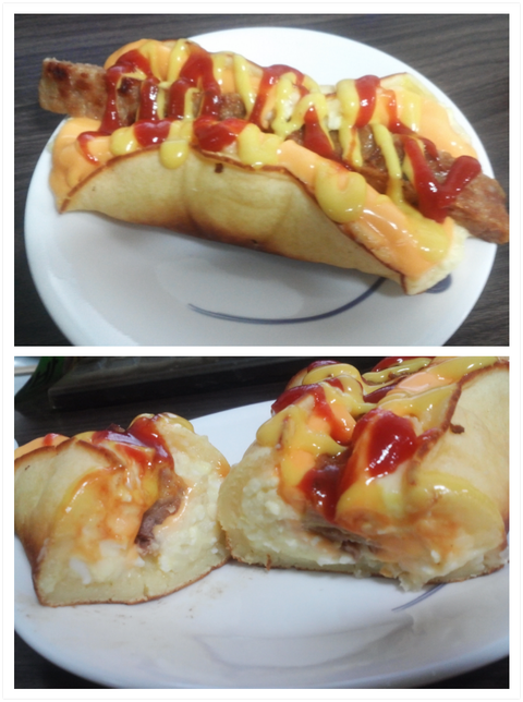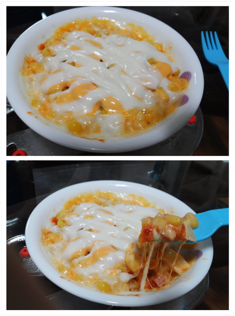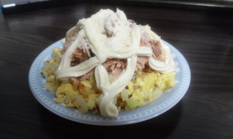 떠먹는 피자. 감자랑 달걀 삶아서 으깨서 마요네즈넣고 햄과 양파와 오이와 기타등등을 넣고 피자소스를 뿌리고 치즈를 올려 만든 겁니다.