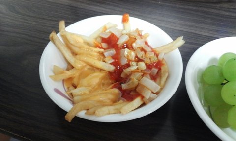 햄버거 먹고 남은 감자튀김. 스파게티소스에 마늘과 양파를 썰고 볶아주고 다는 쪽엔 치즈에 우유 조오금 부어서 렌지돌려서 부어줌 굿굿