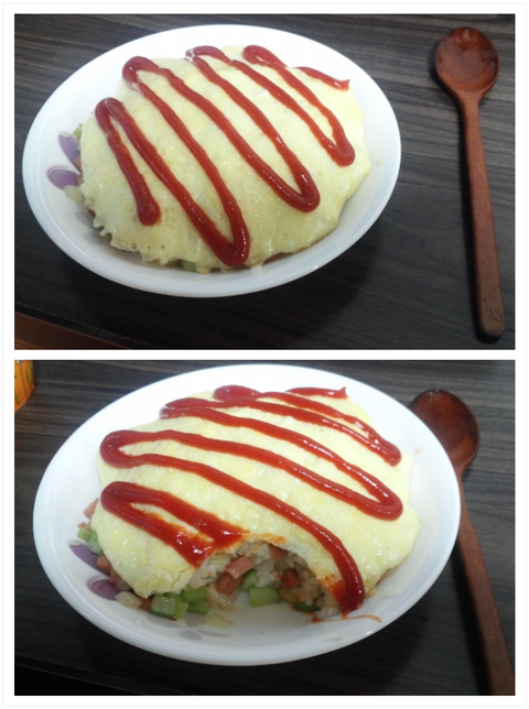 볶음밥 오므라이스. 걍 오이 맛살 햄 양파 등등 넣고 볶아서 달걀올린 것