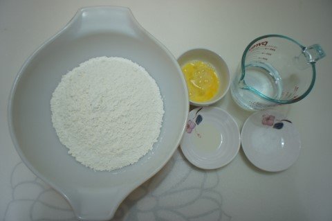 2. 밀가루 3C.계란1개. 꽃소금1t. 식용유1t를 넣고 물로 반