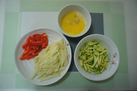 채썰고 계란도 지단을 만들고 붉은 색인 파프리카도 고명