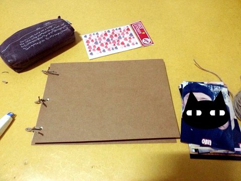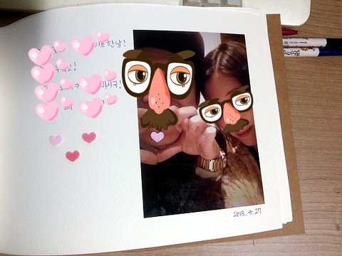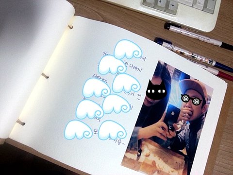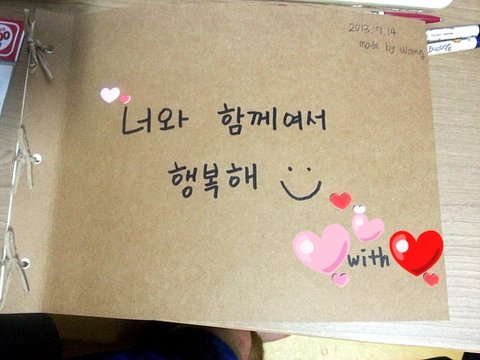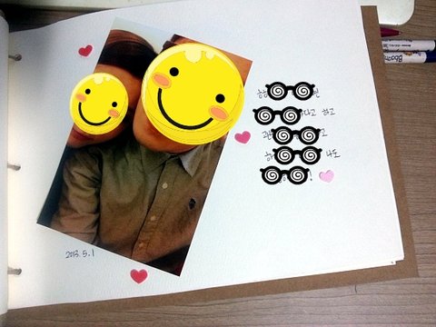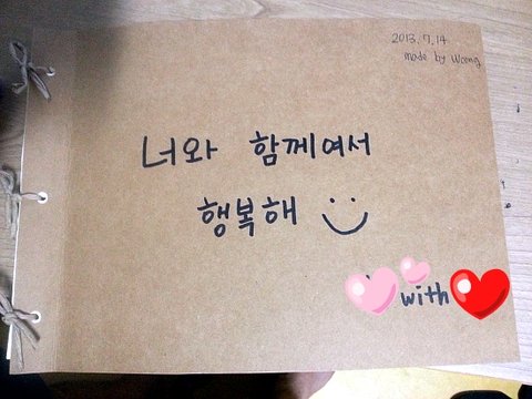 준비물: 커플사진(핸드폰으로 찍은걸 인화! 장당 250원), 크래프트지(겉표지), 머메이드지(속지), 볼펜, 종이끈