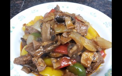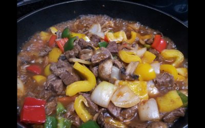 파프리카+마늘쫑+햄을 불고기에 말아 함께 조려냄...