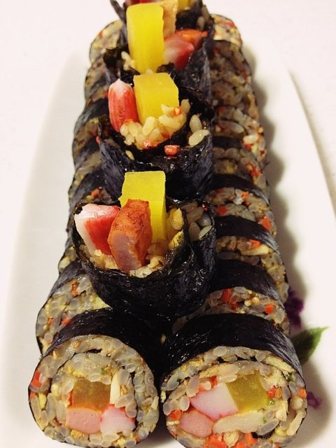 찬밥 처리용으로 굴소스볶음밥을 만들어서 김밥말았던 거.