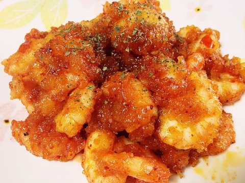 깐새우를 튀김옷입혀서 튀긴 후 칠리새우에 조리면 됨.