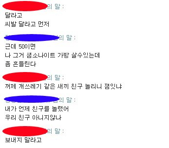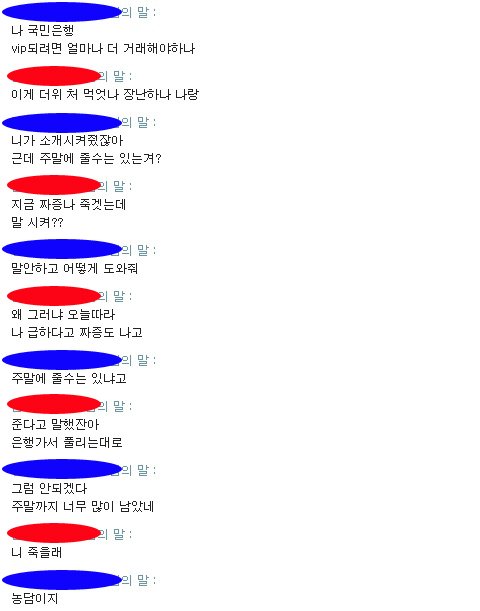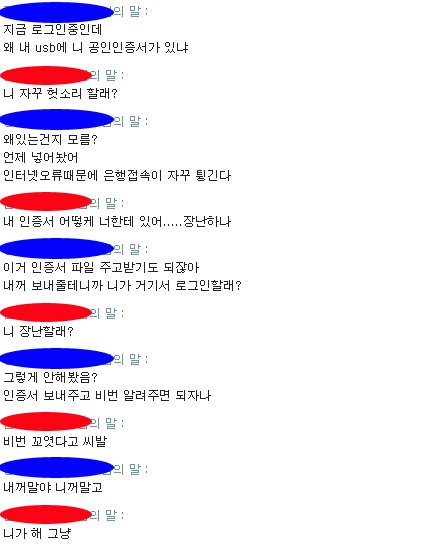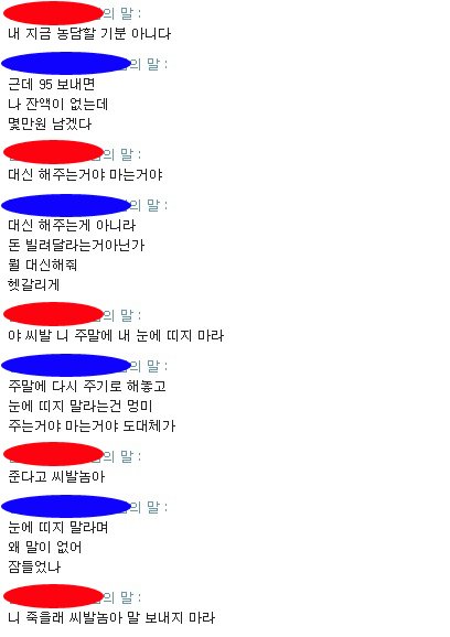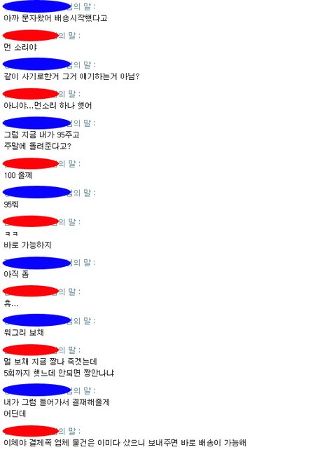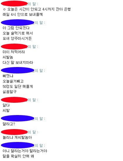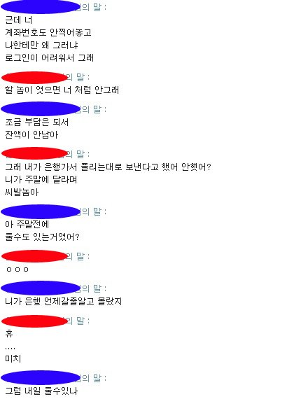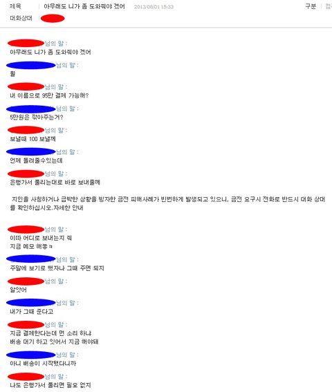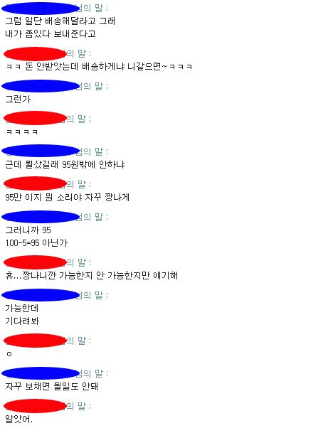 대화명을 가렸는데 파란색이 저, 빨간색이 사기꾼입니다