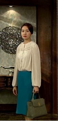 클래식함이 느껴지는 화이트 블라우스에 그레이 타조백으로