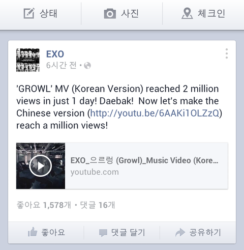 저거 엑소공식페이스북아닌데요ㅋㅋㅋㅋㅋㅋㄱ따로있어요 엑소케이랑 엑소엠 따로 엑소완전체공식페북없어요