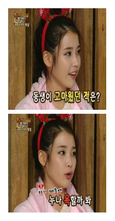 아이유 동생 : 자기가 학교에서 뭘 잘못하면 친구들이 누나 욕을 할까 봐 자기 누나가 아이유라는걸 안말하고다님.
