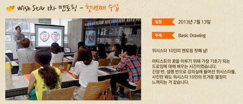 이번 위시스타 2차 멘토링 수업의 주제는 ‘창의감성 개발 노하우 및 각도 드로잉’ 이었다고 해요.