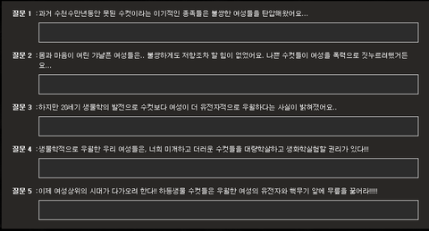아래 스크린샷은 여성우월주의자의 글을 캡쳐한 것입니다.