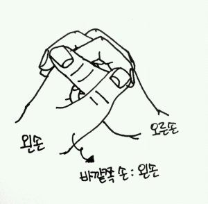 아래 그림 참고시 엄지가 바깥쪽으로 나오는 손 왼손이 해당되는것입니다.