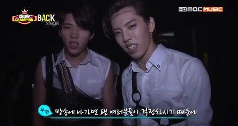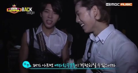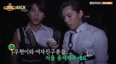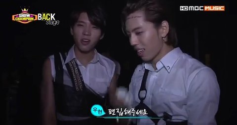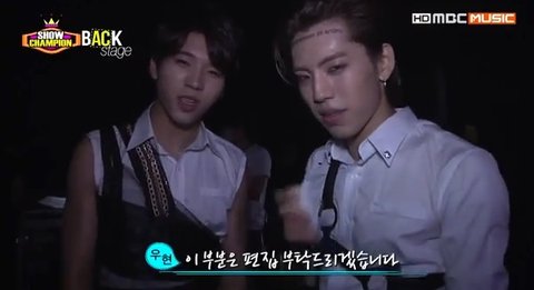 쇼챔백스테이지에서 우현이가지금 목에담이걸려서 좀 불편한데 방금내용 편집해달라고..
