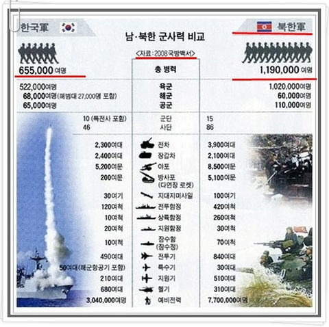 우리나라의 병력은 모두 360만 정도이고 북한의 병력은