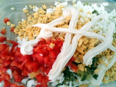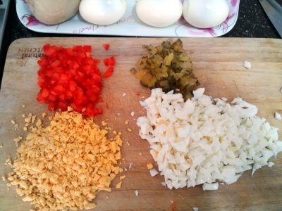 피클,파프리카 잘게 썰고 삶은 달걀 으깨고 치즈, 햄, 토마토 슬라이스해서 넣어줌