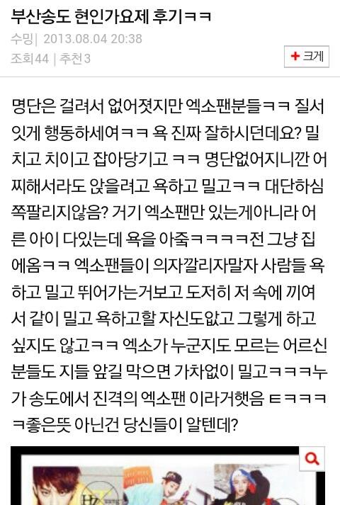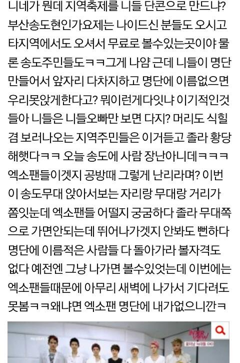 방금 이거봣는데 진짜 내가 민망하다 명단만든거 거의 타지역사람들이 와서 자기들 호텔 방잡아두고 명단 만들엇다는데 우리지역도 잇울꺼봐ㅋㅋ 저 지역 사람들은 이번 엑소팬들한테 좋은감정 아닐듯 어느순간 갑자기 엑소 온다거 햣는데 자기들끼리 명단만들고 그 지역분들까지 명단없인 못보게ㅋㅋ대단하다