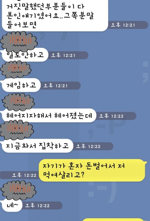 제가 일도안하고 집에서 놀기만했다며 자신이 돈벌어 절먹여살리다가 헤어지고 지금남자만나는데 이제와서 집착하는 정신병자라구요..ㅋㅋ