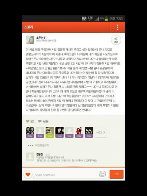 진짜 저런글 보면 정신머리가 있나없나가 궁금하다 아빠가 심부름 좀 시켰다고 꼬봉꼬봉거리는데 할말인가 저게 진짜 개호로잡년 키워놔봤자 저런 소리나 씨부릴꺼면 걍 나가지 나갈자신도 없는게 집태워버린다 어쩐다 입만 살았지 아빠가 저러라고 돈벌어가며 키운줄아나 초딩이 허세병 걸려서 술 담배 지랄 거리는데 조카 무서워 디지겟네 무서워서 살겠나;