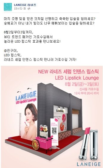 라네즈 LED 립스틱 출시기념 팝업 라운지가 가로수길에서 열렸었다고 해요