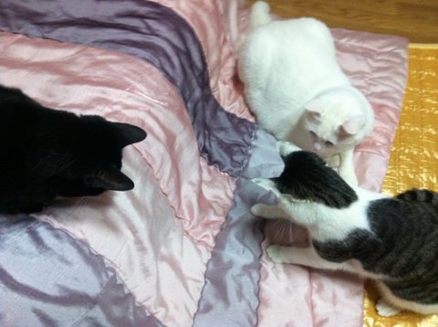 비단(?!!) 이불 깔아놓고 세 냐옹님께서 호작질 중이심.