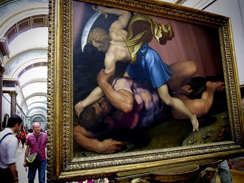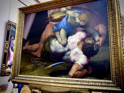 다윗과 골리앗의 싸움을 다룬 작품인데 똑같은 장면을 서로 반대편에서 바라본 걸 보여주고 있어요ㅎ