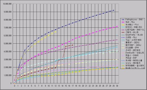 예를 들어 2ne1의 그래프가 제일 모범적인(?) 그래프라고 할수 있죠 꾸준히 올라가는게 근데