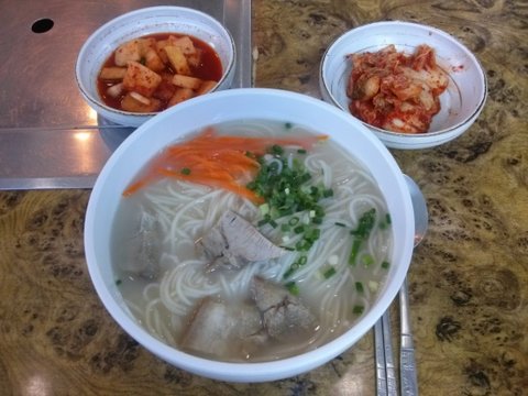 뽀얀 고기국물에 중면으로 삶은 국수와 돼지고기![]()