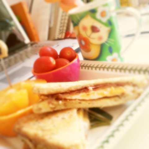 7) 토요일 아침에 제가 차린 아침인데요 ~ 어떤가요? 햄,치즈,계란 토스트 :) 오렌지는 아빠가 잘르는것 처럼 잘라봤어요 ~