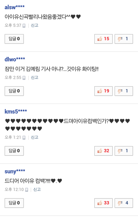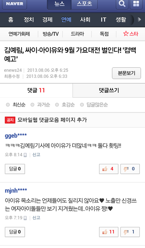 분명히 김예림기사인데...사람들이 아이유만 기대되나봄.....기사 제목도 어이없다...김예림 안티는아니지만 언제부터..김예림=싸이=아이유=벜벜 이엿나...